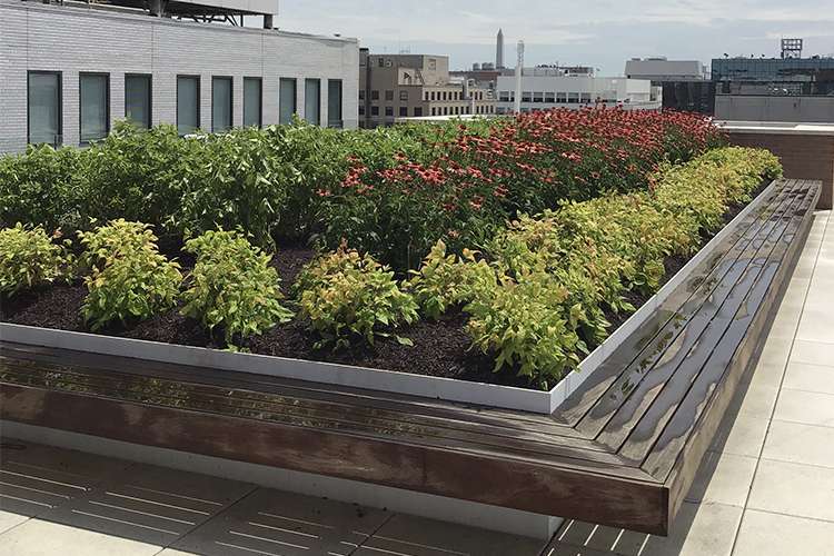 “Any rooftop planting is difficult,” Rill says. “The first challenge was getting 100 plants up to the ninth floor patio.”